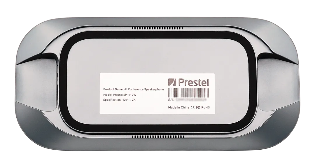 Спикерфон Prestel SP-112W — беспроводной настольный с Bluetooth. 12 микрофонов, радиус действия 5–8 м. Подавление шума и эхо, полный дуплекс, AGC. Подключение до 5 устройств каскадом.