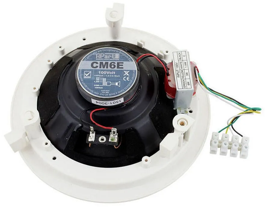 Модель APart CM6E относится к встраиваемой в потолок акустике серии CM. Тем не менее, это надежная, легкая и качественно собранная колонка, которая может использоваться как для обычного прослушивания музыки, так и для оповещения с помощью микрофона, например, об эвакуации, или для рекламных сообщений и музыкального фона в супермаркетах, ресторанах, для озвучивания лекций и докладов в конференц-залах, различных аудиториях и т.п.Акустика APart CM6E оснащена широкополосным динамиком с особым двухконусным бумажным диффузором, который компания позиционирует как dual cone, т.е. это обычный 6,5-дюймовый мидвуфер, в центре которого установлен еще один компактный конус, отвечающий за передачу высоких частот. Благодаря такой конструкции обеспечивается цельное звучание и более точная диаграмма направленности.
