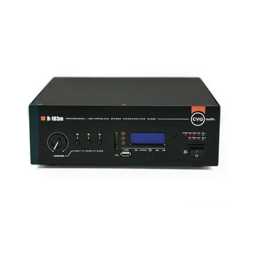 CVGaudio R-103m — миниатюрный микшер-усилитель для систем фонового звука. Мощность: 2х50W при 8ohm, 2х75W при 4ohm. Диапазон сопротивления нагрузки: 4–8ohm. Режимы работы: stereo/parallel/bridge.