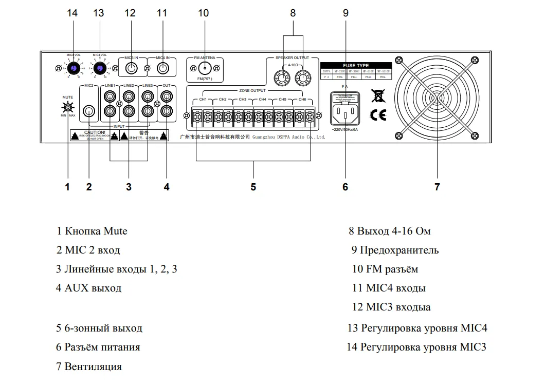 Вход: 4 x jack (MIC), 3 х 2RCA (LINE);