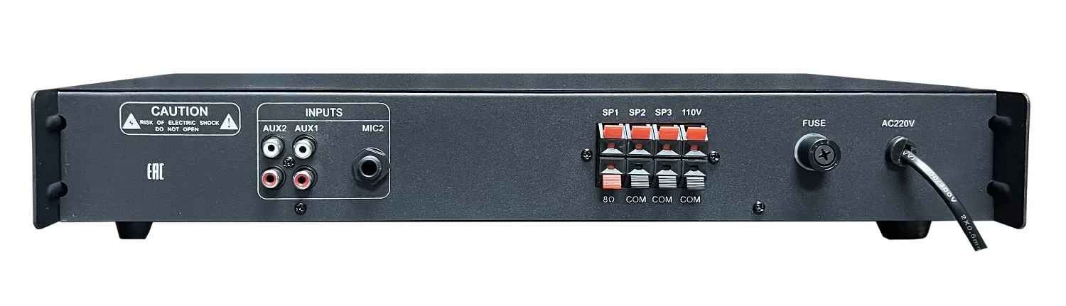 Входы: 2 MIC (Jack 6.3 мм), 2 AUX (2RCA). Выходы: 70/100В (6 зон), 8 Ом, AUX (2RCA).