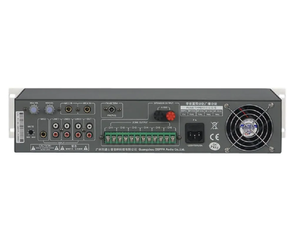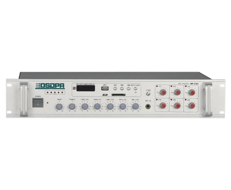 Микшер-усилитель DSPPA MP-210U — это комбинированное устройство с 6 зонами и регулировкой уровня сигнала. Мощность — 60 Вт/100В. Имеет 4 микрофонных, 3 линейных входа и 1 AUX выход. Поддерживает цифровой AM/FM-тюнер, MP3-плеер и USB-порт. Питание от сети 220В. Есть ЖК-дисплей и защита от короткого замыкания и перегрузки.