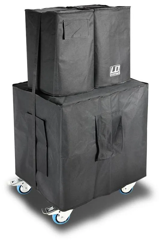 Комплект LD Systems DAVE 12 G3 SET включает тележку, чехлы для сабвуфера и сателлитов с ремнём для крепления.