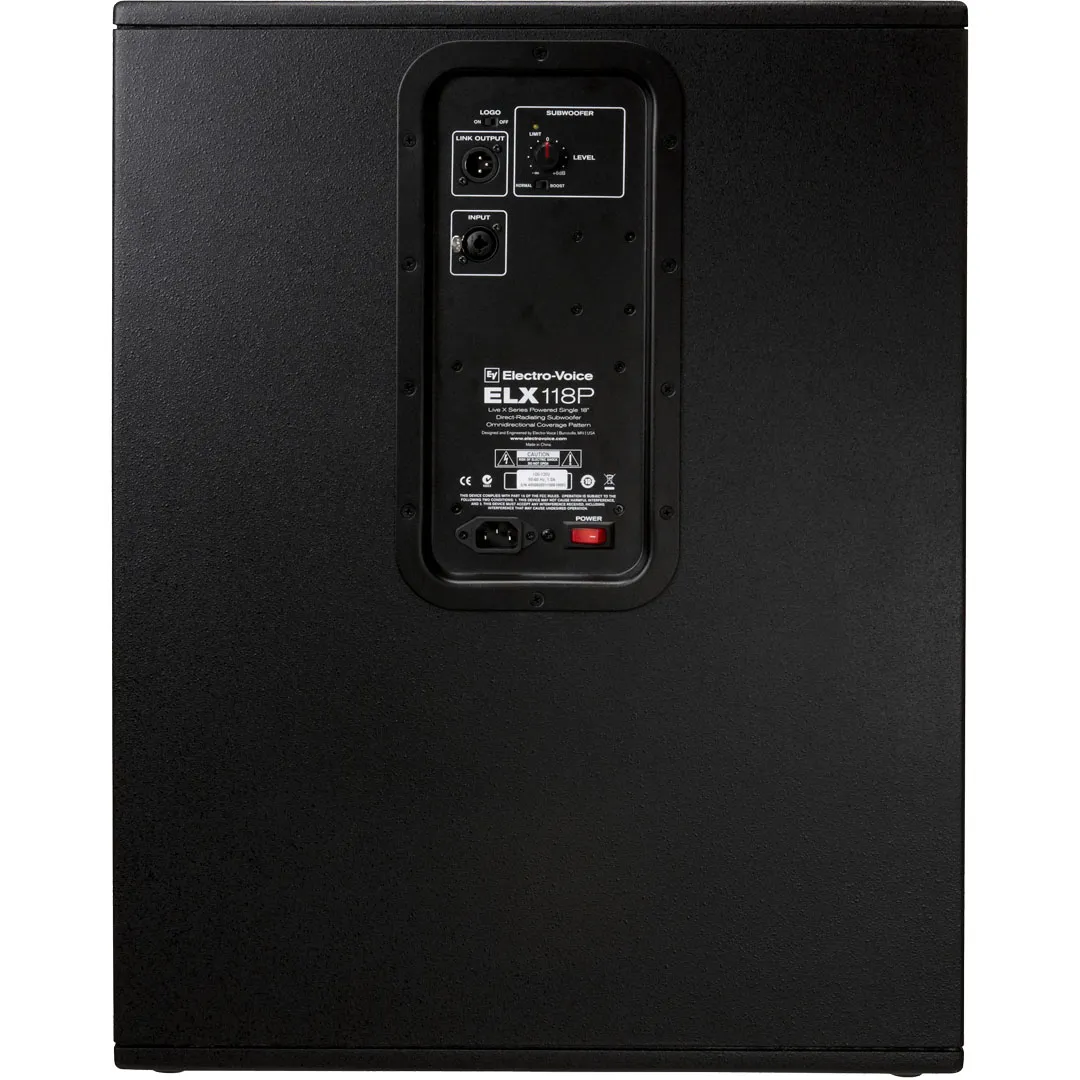 Активный сабвуфер ELECTRO VOICE ELX118P — мощный инструмент для усиления низких частот. Усилители D-класса (700 Вт) и НЧ-драйвер (EVS-18K) обеспечивают стабильную работу и качественное звучание. Мощность — 400 Вт, пиковая — 1600 Вт. Частотный диапазон: 42–100 Гц (-3 дБ) и 32–130 Гц (-10 дБ). Корпус из многослойной фанеры, чёрное порошковое покрытие. Габариты: 661 х 507 х 574 мм, вес — 31,3 кг.