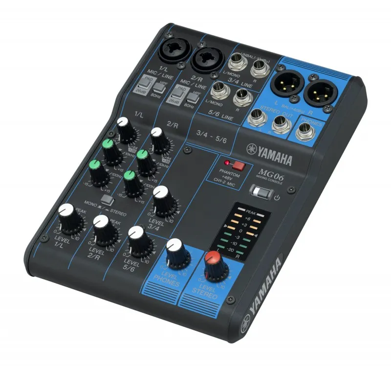 Yamaha MG06 — компактный 6-канальный микшерный пульт для студий, сцены и дома. Имеет микрофонные предусилители А-класса и индикатор пикового уровня. Оснащён разъёмом для наушников, балансными выходами XLR и эквалайзером.