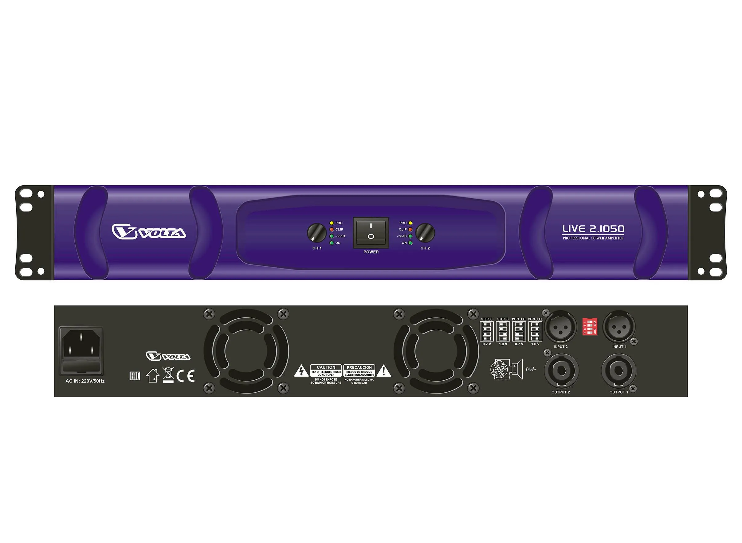 Volta LIVE 2.1050 - профессиональный усилитель мощности VOLTA LIVE 2.1050 предназначен для использования в стационарных и мобильных звуковых комплектах совместно с любыми акустическими системами.Выходная мощность (8 Ом): 700 Вт x2