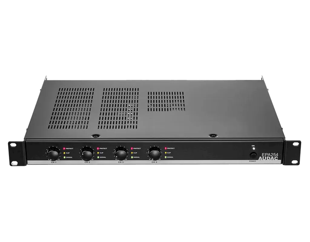 Audac EPA254 — энергоэффективный стереоусилитель мощности с 4 входами XLR. Использует технологию класса D для высокой эффективности и качества звука. Оснащён системой защиты от перепадов тока, короткого замыкания, перегрева и перегрузки. Режимы работы: мостовой, стерео, параллельный. Есть отключаемый кроссовер 120 Гц.